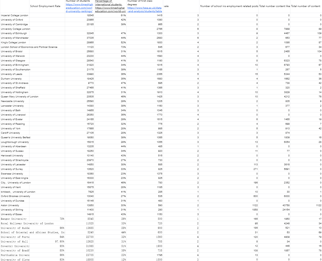 Our group made an analysis for the second scenario, citing many examples of factors contributing to influencing online engagement and unanimously deciding that the need for mental health support and the operationalisation of the school system played a greater role. Students with good mental health may be more inclined to actively participate in digital platforms, and conversely, avoid them because of their issues. However, when we looked for data, we found that data on mental health has privacy implications and is difficult to access. We then decided to change our minds and look at school employment to understand digital engagement, as some digital platforms where universities offer careers guidance services publish relevant posts, and students' engagement on the platforms (e.g., comments and likes) can also reflect their readiness for employment.As Crawford argues that the way data is understood, captured, classified, and named is fundamentally an act of world-making and containment. Our group will consider categorising the dataset.