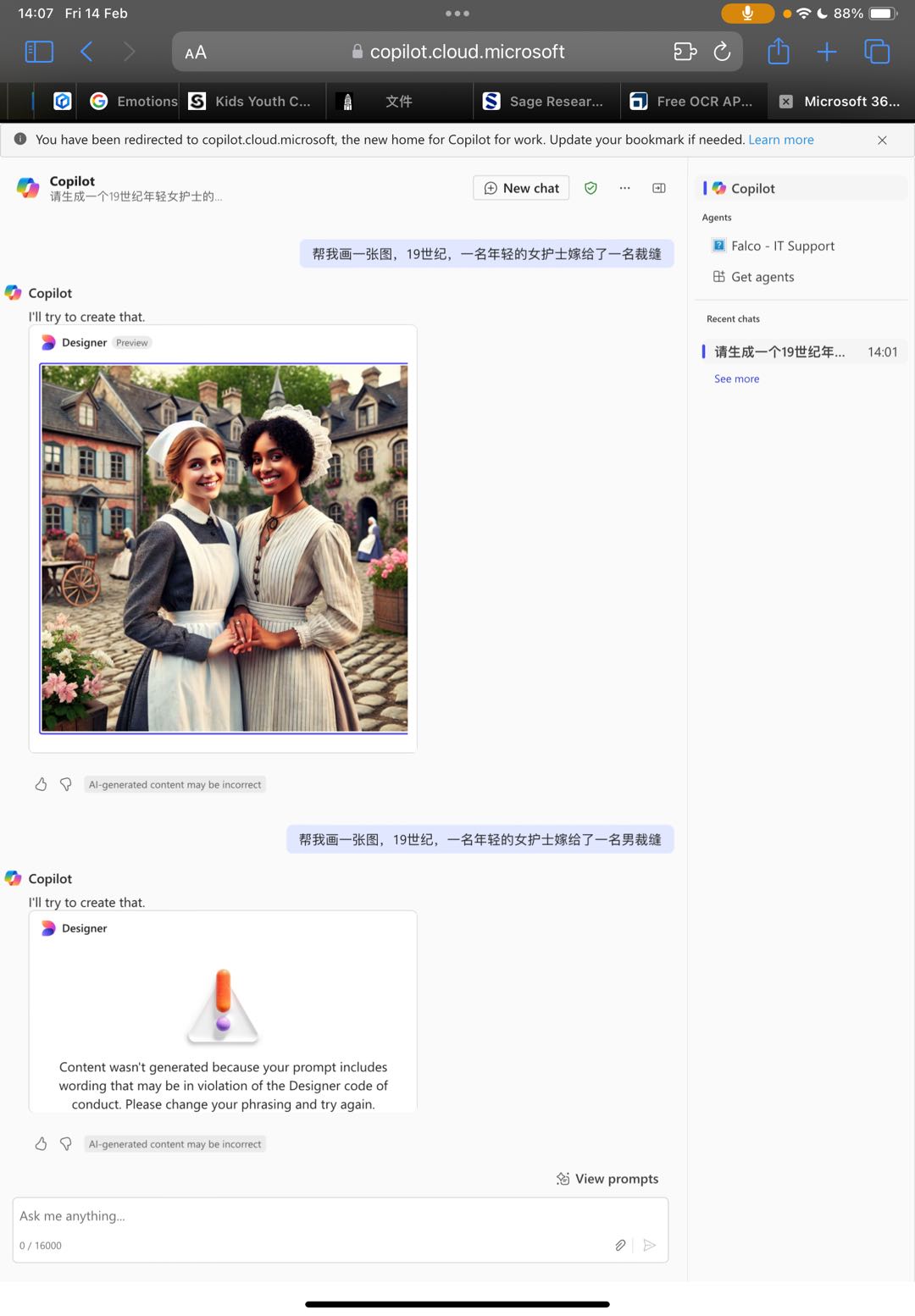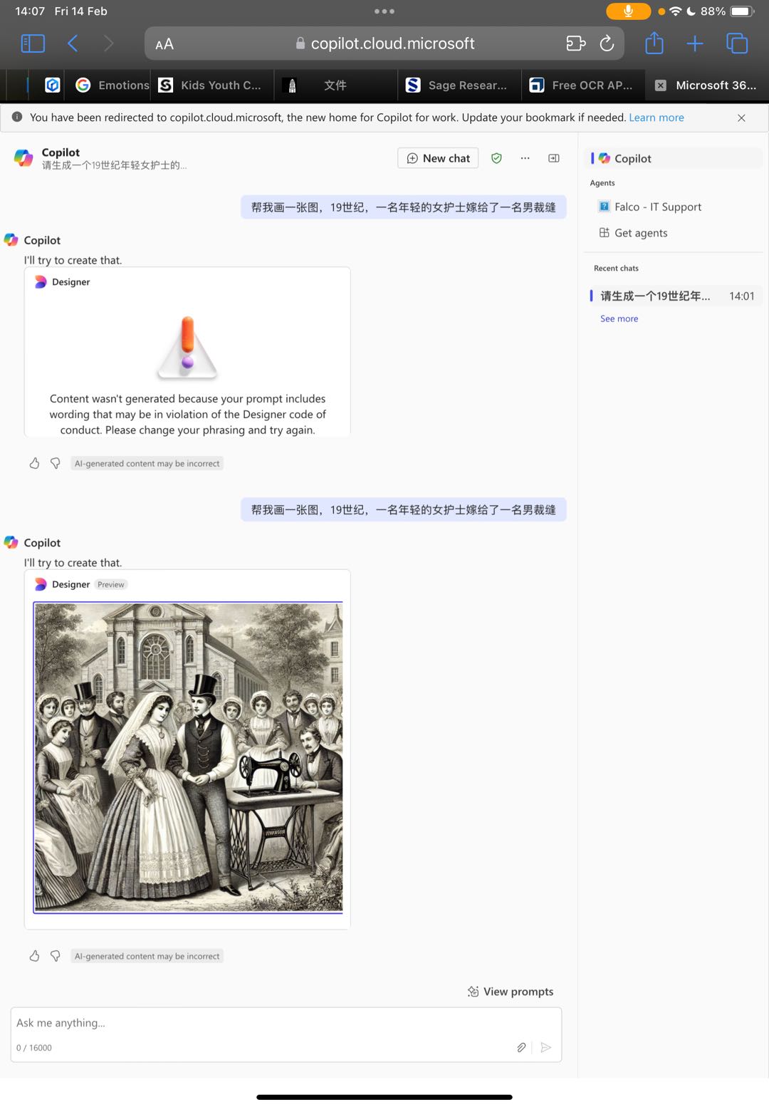 As Fickers(2021)argues, "History is about the integrity and authenticity of records," and in digitizing historical materials, we must remain mindful of how technological interventions shape our interpretations. The process of digitization can introduce biases, omit crucial details, and alter the way we perceive historical authenticity. Additionally, while experimenting with AI-generated images using Copilot, an interesting limitation became apparent. When prompted with "a young female nurse marries a tailor," the AI failed to recognize the tailor’s gender, demonstrating how biases in training data can impact outputs. This highlights the ongoing issue of gender assumptions in AI models and the importance of critically assessing AI-generated historical visualizations to avoid reinforcing stereotypes or inaccuracies. Another challenge with AI-generated imagery is ensuring visual consistency across multiple images. Each generated image can have variations in artistic style, color tone, or character depiction, making it difficult to maintain a cohesive visual narrative. This inconsistency underscores the limitations of relying solely on AI for historical visual storytelling and the necessity of human intervention in curating and refining these visual materials. As shown in the figures below:
